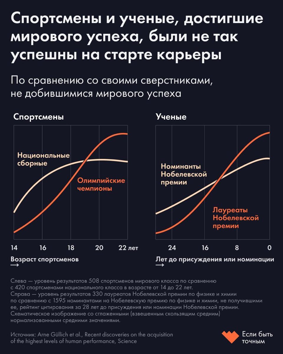 Десятилетиями системы отбора в образовании, спорте и науке опирались на простую логику: как можно раньше найти способных детей и ускорить их развитие, чтобы они быстрее достигли наивысших результатов. Новый масштабный обзор показывает, что это не самая удачная стратегия. Исследователь Арне Гюллих с соавторами проанализировал данные о более чем 34 тысячах людей, достигших высших уровней в своих областях. Среди них были олимпийские чемпионы, нобелевские лауреаты, ведущие шахматисты и композиторы. Во всех рассмотренных областях обнаруживается закономерность: ранний успех слабо связан с достижением мирового уровня во взрослом возрасте. 🔺Нобелевские лауреаты в начале карьеры в среднем накапливали научное признание медленнее, чем сопоставимые по уровню коллеги, которые в итоге не стали лауреатами. 🔺В шахматах игроки мирового уровня в подростковом возрасте в среднем имели более низкие рейтинги, чем сопоставимые по уровню шахматисты. 🔺Будущие олимпийские чемпионы на раннем этапе показывали