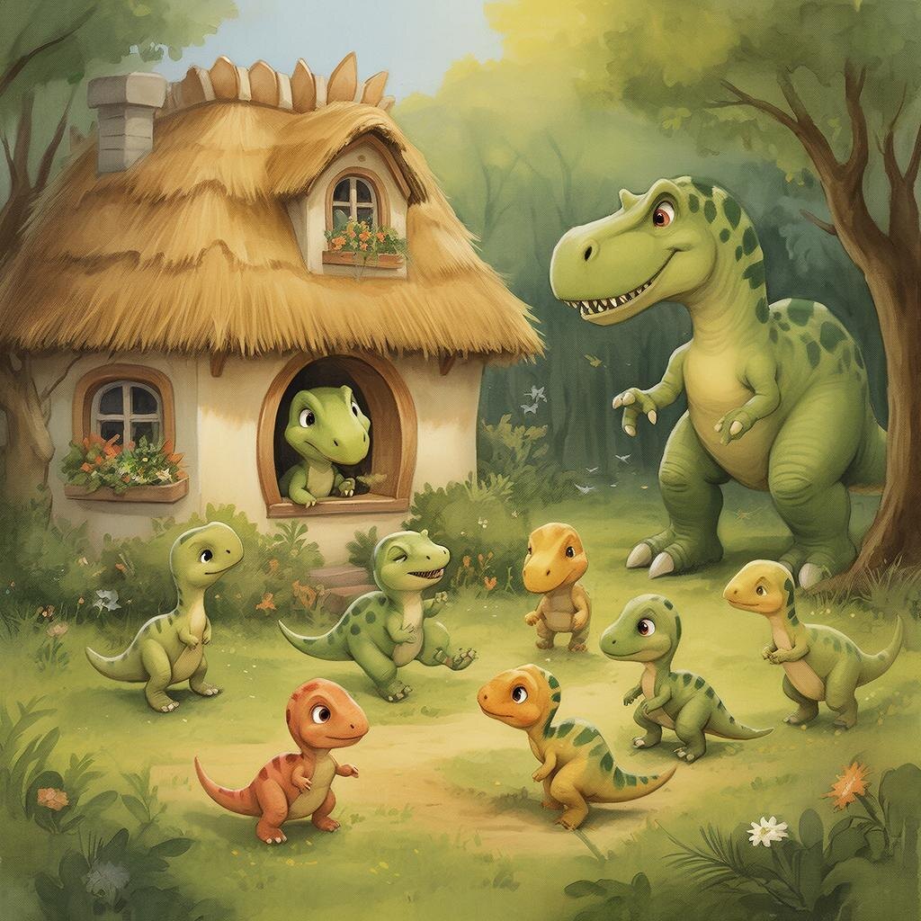 Но хищный Тираннозавр, который прятался за скалой, всё подслушал. «Отличная закуска! Семь сочных малышей!» — подумал он и потер свои короткие лапы.