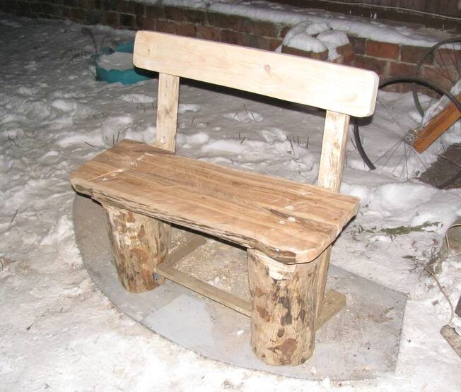 Незаметно наступила зима, выпал снег, все строительные работы на даче отложили до весны. Но чтобы не сидеть без дела, можно мастерить какие-нибудь мелочи, например, сделать деревянную лавочку для дачи. Когда мы выпиливали на даче старый сад, стволы деревьев не сжигали, а складывали в сторонке. Пришло время – они нам пригодились. Итак, начинаем мастерить лавочку. Сиденье для садовой скамейки изготовим из метрового ствола яблони. Закинуть автору на чай можно здесь. Мы распилим его бензопилой вдоль на две равные части, аккуратно закруглим углы. Топором срубим кору, ведь именно под ней живут личинки, которые разрушают ствол дерева. Соединим оба среза вместе – это будет сиденье нашей лавочки. Чтобы щель между половинками была минимальная, начертим на бревне ровную линию, лишнее отрежем бензопилой. Для ножек садовой скамейки подберём берёзовые пеньки высотой 40 см. С них тоже срежем кору, отшлифуем, затем обработаем защитным антисептиком. Диаметр пеньков не позволяет нам положить на них две
