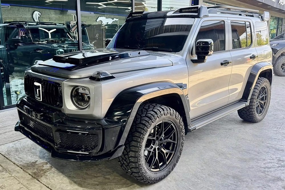 В Таиланде представили тюнинг-версию китайского внедорожника Tank 300, стилизованную под Mercedes-AMG G63 в обвесе Brabus. Проект реализовала мастерская Shana E-Sport, предложив альтернативу культовому «Гелику» для тех, кто хочет эффектный внешний вид без многократной переплаты за оригинал. В рамках переделки Tank 300 получил полностью переработанную переднюю часть с новой решеткой радиатора, круглыми светодиодными фарами, вентиляционным капотом и агрессивным бампером с воздухозаборниками в стиле AMG. Также в состав стайлин-пакета входят расширенные крылья с декоративными элементами, массивные накладки, иной задний бампер с диффузором, спойлер и декоративный кожух запасного колеса. В зависимости от конфигурации возможна установка имитации четырех выхлопных патрубков или бокового выхлопа, как у G63. Автомобиль комплектуется 22-дюймовыми колесами с внедорожными шинами, а также может быть дооснащен доработанной подвеской и усиленными тормозами. Интерьер также подвергся глубокой переработк