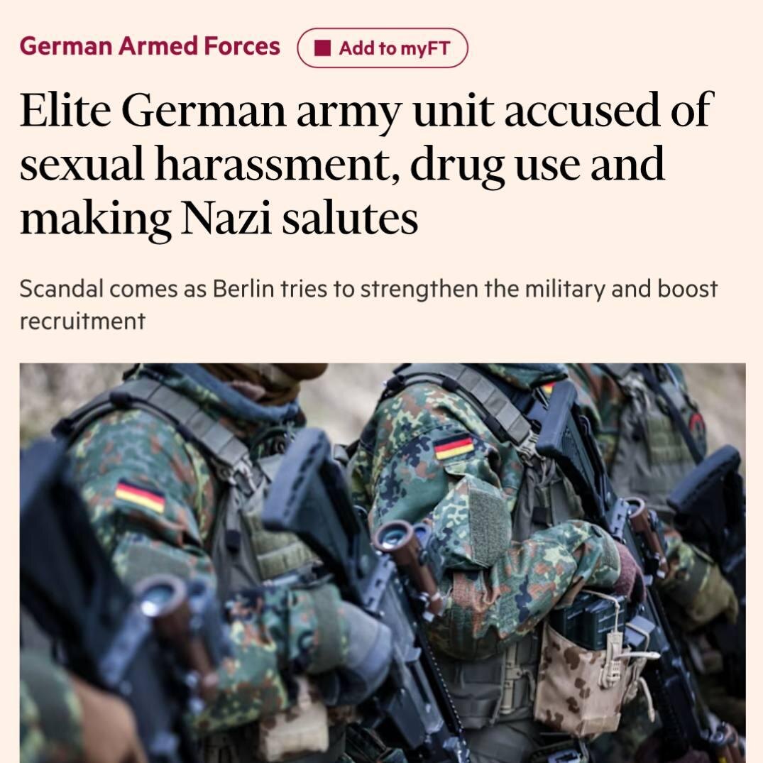 Солдат элитного 26-го парашютно-десантного полка в городе Цвайбрюккен подозревают в сексуальных домогательствах, употреблении наркотиков и использовании нацистской символики. Трех военных уже уволили, еще 19 могут отстранить от службы. Расследование началось после жалоб женщин-десантников, которые заявили о непристойных шутках, угрозах и унижениях. СМИ также сообщают о существовании в подразделении ультраправой группы и жестоких действиях командиров. «Армия ценностей» как она есть. 👍«БайБайден» в МАХ
