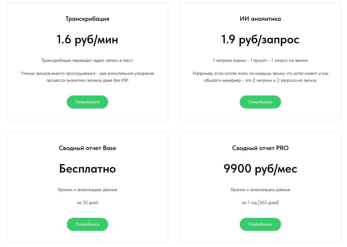 Тарифы нового сервиса https://callparserai.com/ (транскрибация и ИИ аналитика звонков) Думал пакетно продавать по минутам, но не удобно, тк у разных клиентов на одну минуту звонка может быть разный набор услуг Поэтому получилось так 1. Стартовый бюджет любой, оплачивать пакет на 50 000 не надо. Можно закинуть 500 руб и потестировать. 2. Если хотите просто транскрибировать звонки в текст чтобы читать диалог - 1.6 руб/мин 3. Если хотите добавить ИИ аналитику диалога, то 1 метрика - 1 промт - 1 звонок - 1.9 руб. Чем больше аналитики - тем дороже, но зато не будет аналитики ради аналитики - только самое важное. 4. Отдельная доплата кому нужна сводная аналитика за длительный период (до года) за хранение данных. До 30 дней - бесплатно. Если у вас много звонков и хотите автоматизировать их прослушивание и аналитику - оставьте заявку на сайте - настроим.