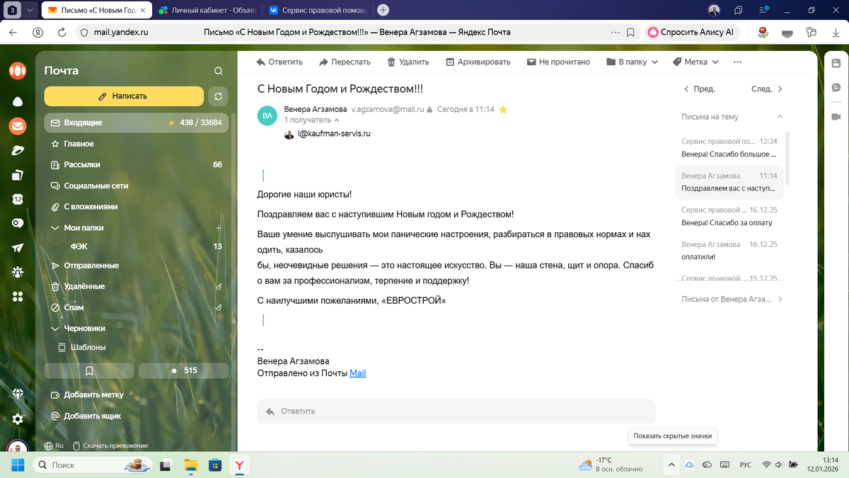 Клиентка Венера поздравила нас, и это было великолепно! Спасибо за теплые слова о нашем сотрудничестве.