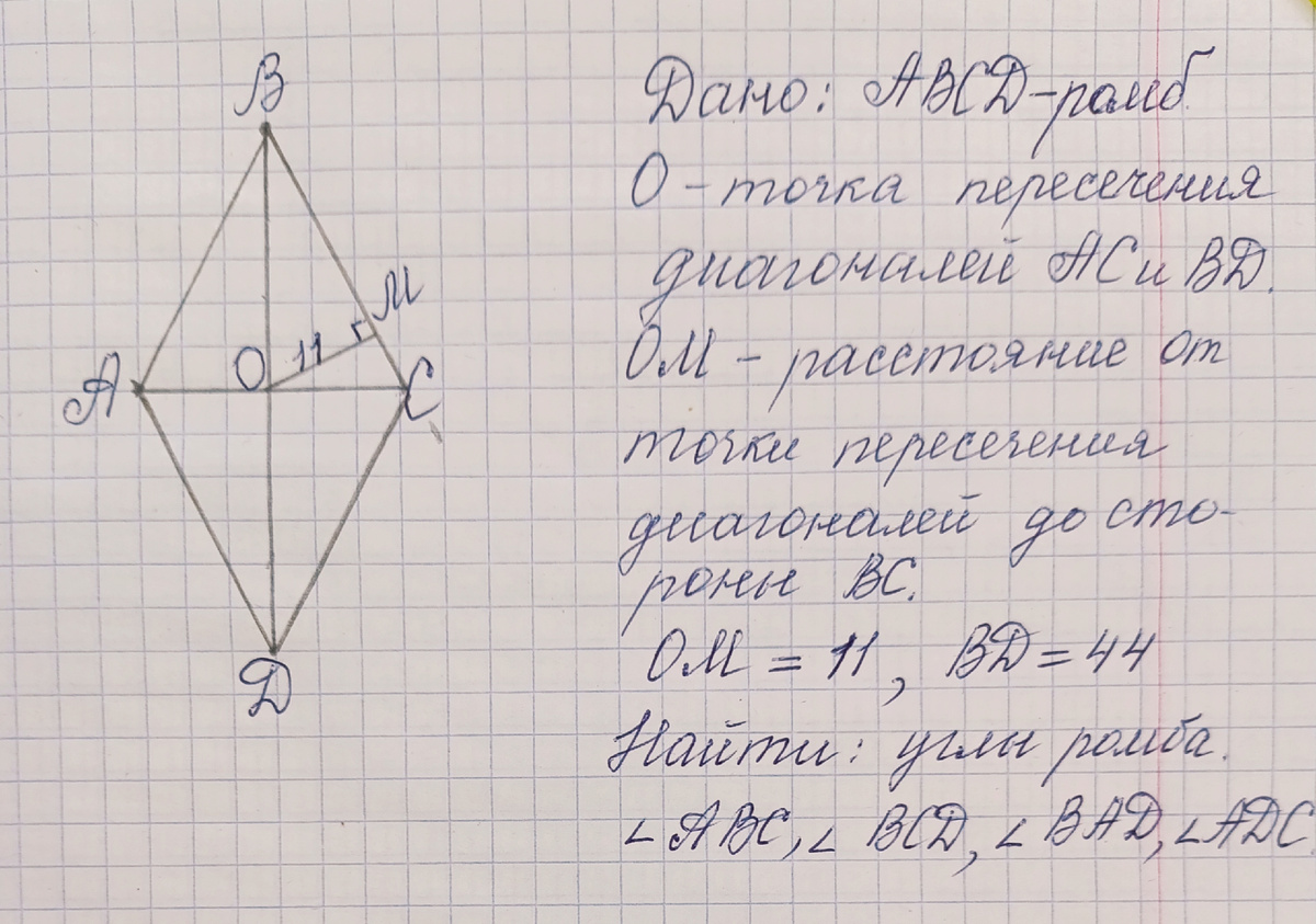 Расстояние от точки пересечения диагоналей ромба до одной из его сторон равно 11, а одна из диагоналей ромба равна 44. Найдите углы ромба.