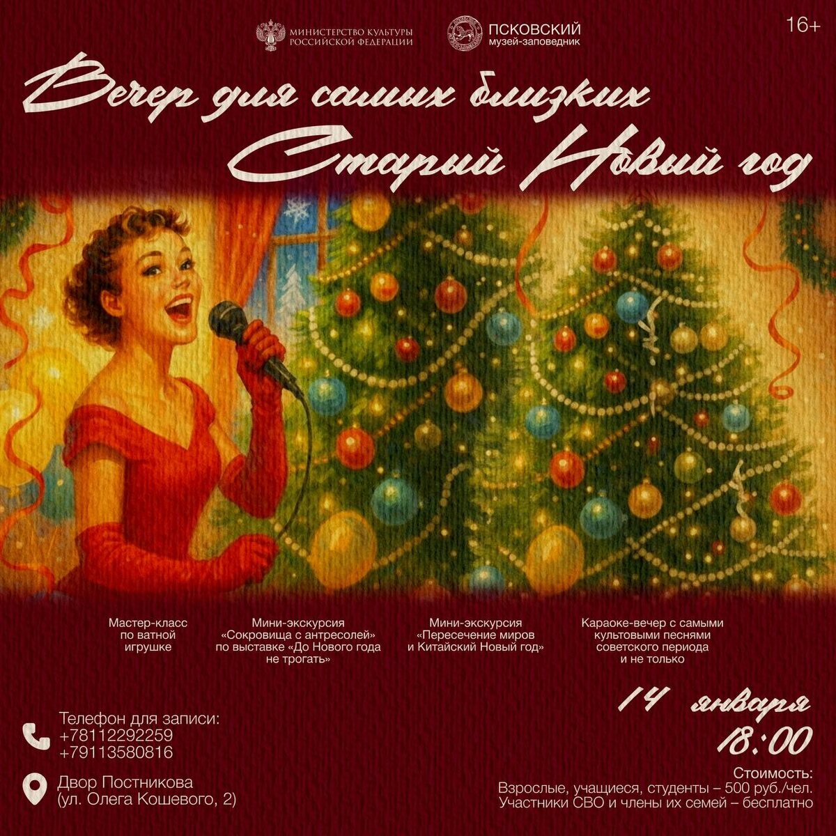 🌲 Гостей ждут: ✨ Мастер-класс по ватной игрушке; ✨ Мини-экскурсия «Пересечение миров и Китайский Новый год»; ✨ Мини-экскурсия «Сокровище с антресолей» по выставочному пространству «До Нового года не трогать». Вечер завершится караоке с самыми знаковыми песнями советского времени и не только. 📆 14 января в 18:00. 📍 Двор Постникова (ул. О. Кошевого, 2). 🎟 Взрослые, учащиеся, студенты – 500 руб./чел., участники СВО и члены их семей – бесплатно. 📞 Запись по телефонам: +78112292259, +79113580816. Оставайтесь с нами #НашаПсковскаяобласть