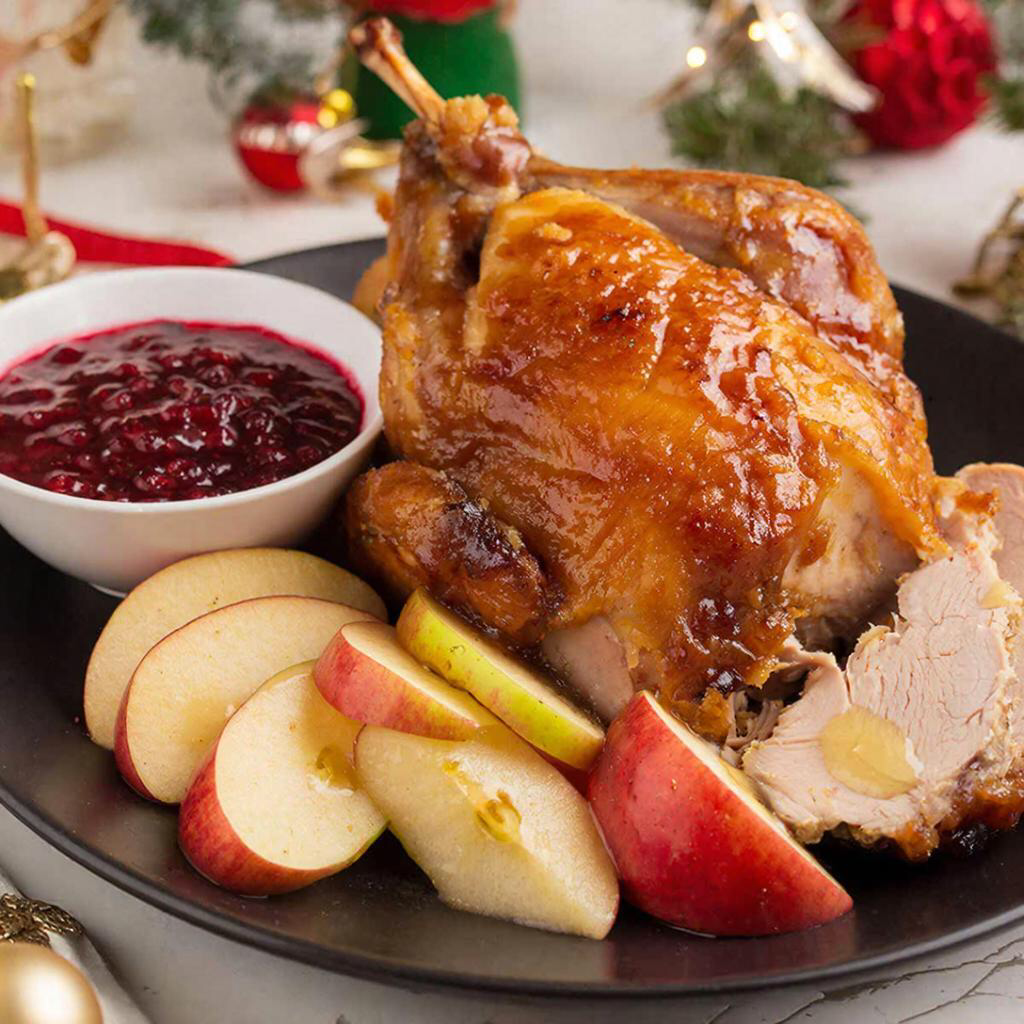 2. Порежьте филе ломтиками и подавайте горячим с яблоками и брусничным соусом.