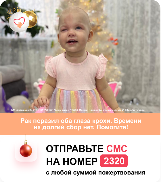 Времени на долгий сбор нет. Только лечение без срывов может спасти Каролину. Иначе ретинобластома может выйти за пределы глаза, проникнуть в структуры мозга, лимфоузлы, дать отдалённые метастазы. Тогда ребёнка уже ничего не спасёт. Помогите малютке избежать трагедии! ПОМОЧЬ КАРОЛИНЕ ПО ССЫЛКЕ > Новый год Каролина с мамой встретили в больнице. Только после очередного курса химиотерапии им удалось на пару дней вырваться домой. Там её всегда ждут с нетерпением два старших брата. Объятия, смех, знакомые игрушки, родные голоса. Несколько драгоценных дней, когда можно просто быть ребёнком. Но счастливое «дома» заканчивается слишком быстро. Лечение откладывать опасно. Чтобы победить РАК, терапию обязательно нужно продолжить. Для этого малютке нужна Ваша помощь! ПОМОЧЬ КАРОЛИНЕ ПО ССЫЛКЕ > Всего за несколько дней до своего первого дня рождения она оказалась не в окружении шариков и подарков, а в больничных коридорах со страшным диагнозом – ретинобластома, Рак обоих глаз. К моменту, когда ди