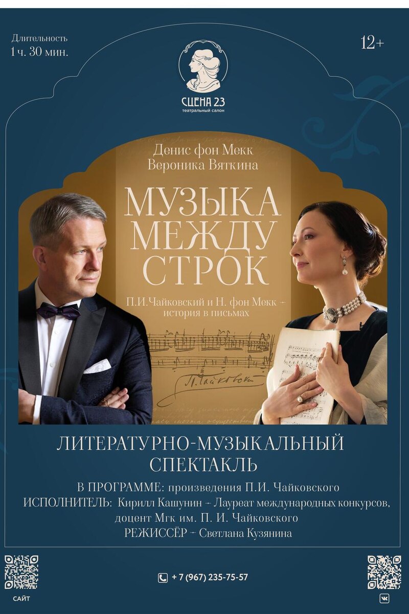 В Москве покажут уникальный спектакль. Спектакль-диалог «Музыка между строк», посвященный самому невероятному роману в письмах в истории — переписке Петра Ильича Чайковского и его покровительницы Надежды Филаретовны фон Мекк, покажут 15 января в Рахманиновском зале Московской консерватории. Письма звучат в исполнении актрисы и благотворителя Вероники Вяткиной и Дениса фон Мекк – мецената и потомка известной династии. Режиссёр проекта Светлана Кузянина создала спектакль об отношениях, которые длились четырнадцать лет. Герои написали друг другу более тысячи писем, в которых запечатлели свои мысли, чувства, переживания. В переписке есть и подробности творческого процесса, и философские размышления, и, конечно, музыка, ставшая связующим звеном и главным героем этой истории (зрители услышат истории о создании «Бури», «Франчески да Римини», Первого фортепианного концерта и других произведений Чайковского). В своих посланиях Петр Ильич и Надежда Филаретовна доверяли друг другу самое сокровенн