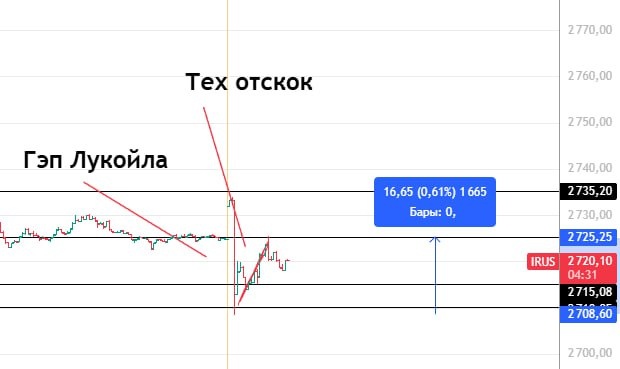 Ожидаемый импульс вниз на гэпе Лукойла и Роснефти Ожидаемый тех отскок на 60% по АТР ММВБ В моменте Волатильность Успокоилась. Расклад следующий: Фон и нефть минусуют Остальная товарка продолжает лететь в космос. Новостей нет, драйвера роста нет как и драйвера коррекции НО на тех отскоке у нас полюбому перевес спек Лонга. Так что Логичнее всего придерживаться плана, если НЕ выйдет позитивных новостей, нам по сути расти не на чем. ____________ Про сценарии. Я писал до начала сессии что оба сценария верные, при оценки общей ситуации шортить ДО ОС, опираясь на технику лонговать после ОС на тех отскок. НО тк как ДО начала сессии мы ни куда не сходили, тех отскок прошел, не вижу смысла переобуваться в лонги. __________ Лично мое мнение сейчас рынок вверх может вынести только НОВАЯ порция новостного позитива. Так что работаю по плану, додерживаю шорт