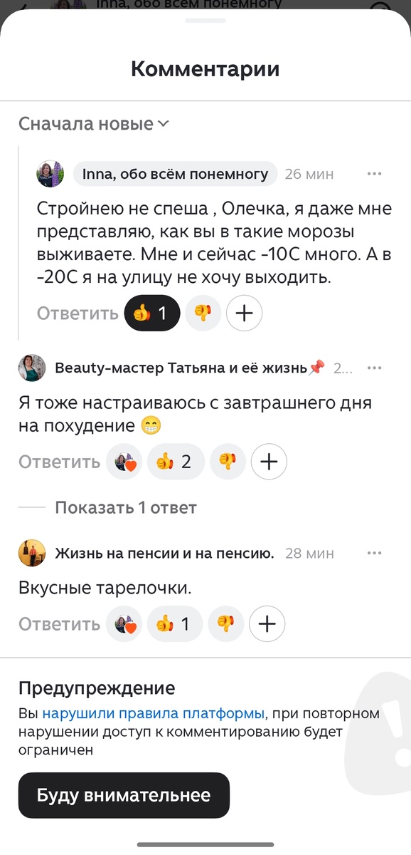 Я не просто в шоке, я в аху........е, если честно. Главно дело без какой-либо конкретики, что-то нарушила, дорогу, наверное, не там перешла. Не хамлю, не грублю, матом не ругаюсь ( ну разве что маленько, и не в инфопространстве , а дома, с любимым мужем 😁😁). Так что , друзья мои, если я вдруг не буду отвечать на комментарии, значит дзен всё таки докопался до меня. Если честно, давно выбешивает эта платформа. Например, я кому-то очень не нравлюсь ( а таких немало ). И вот она, или он, нажимают кнопочку Пожаловаться, просто, без объяснения причин, и дзен послушно реагирует, не разбираясь, кто прав, а кто не очень.