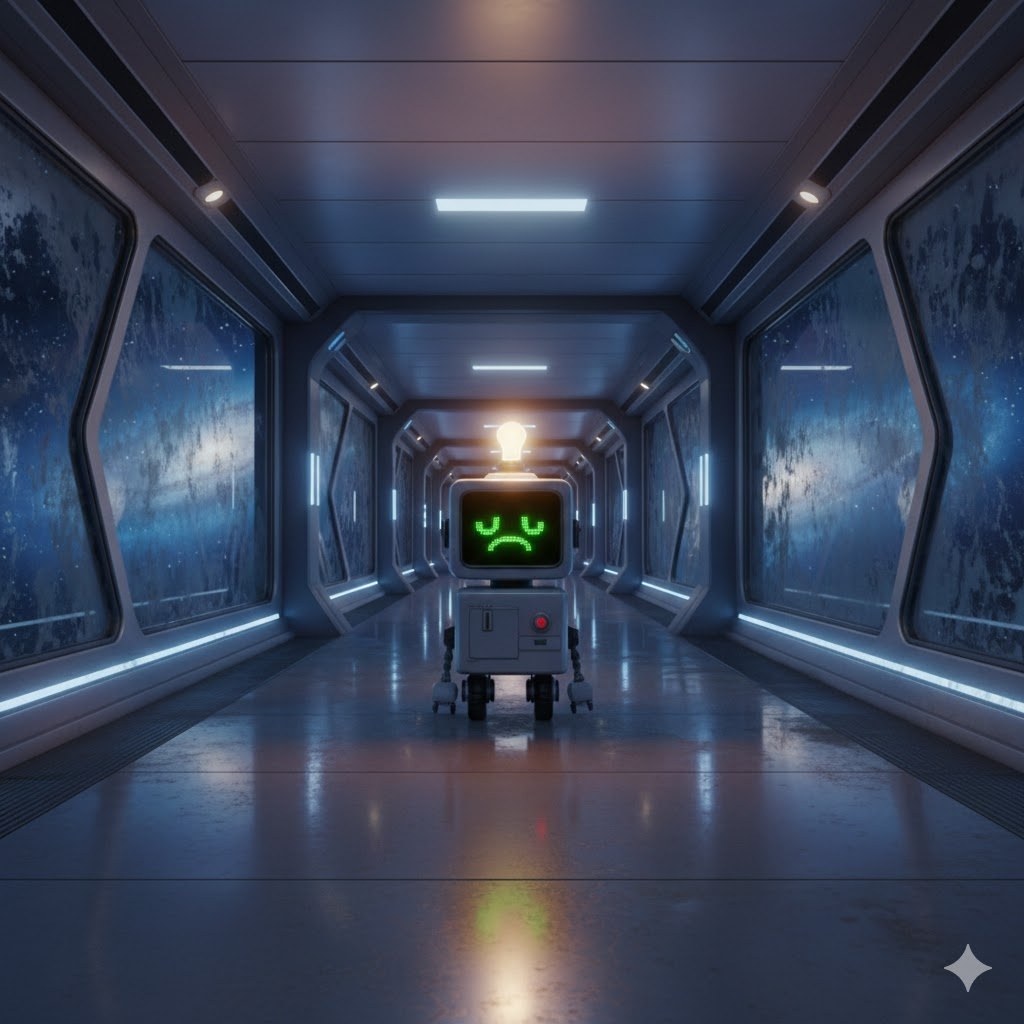 На огромном серебряном космолете «Орион», который летел сквозь бесконечные звезды, жил маленький робот-уборщик по имени Вжик. Он был похож на коробку на колесиках, с двумя манипуляторами-щетками и одной мигающей лампочкой на макушке. Вжик очень грустил. Вокруг него ходили важные роботы-пилоты, сверкающие роботы-навигаторы и сильные роботы-охранники.