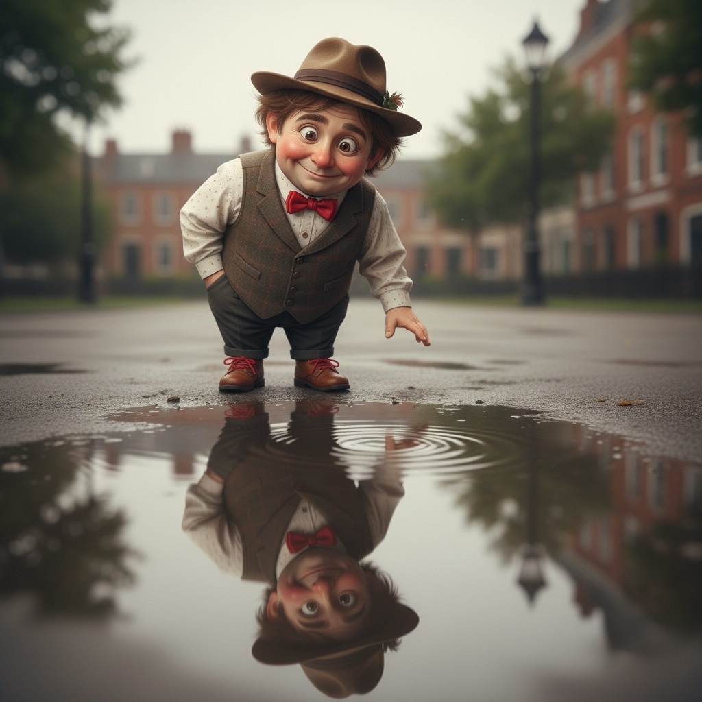 Весёлый и добродушный человечек, небольшого роста, пухленький, в меру конечно, с большими умными глазами чуть чуть с хитринкой и одновременно мудростью, не отрываясь смотрел на свое отражение в чистой и свежей луже. Он был одет в светлую рубашку с галстуком или бабочкой, жилетку, брюки тёмного цвета, коричневые ботиночки с ярко красными шнурками и свою любимую шляпу. Человечек был обладателем непослушной причёски из каштановых волос средней длинны, а также крупного носа картошкой и немного разными по форме ушами, что его не коим образом не портило, а даже наоборот было гордостью и придавало образу добрую комичность.