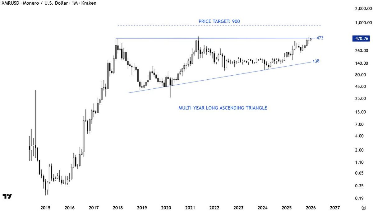 Смотрю на XMR на месячном таймфрейме — и это один из самых тихих графиков на рынке. Без истерик, без шоу, без обещаний. Просто форма, которую рынок рисует годами. Много лет цена упирается в один и тот же потолок в районе 450–480. Каждый подход туда заканчивается одинаково: шум, ожидания, откат. Но есть деталь, которую легко пропустить — каждый откат выше предыдущего. Основание медленно, почти незаметно, ползёт вверх. Это не про импульс. Это про время. Длинный восходящий треугольник, в котором рынок не спорит, а ждёт. Такие конструкции ломаются не от силы, а от исчерпанности. Каждый цикл распродажи заканчивается раньше прошлого. Желающих продавать ниже всё меньше. Уровень сверху не становится крепче — он истончается. Его тестируют годами, снимая ликвидность, привыкая к нему, переставая от него отскакивать. Важно и то, чего здесь нет. Нет хайпа. Нет толпы. Нет ощущения «иксы уже завтра». Когда актив годами ничего не делает, от него уходит публика. Остаются только те, кому важно, заче