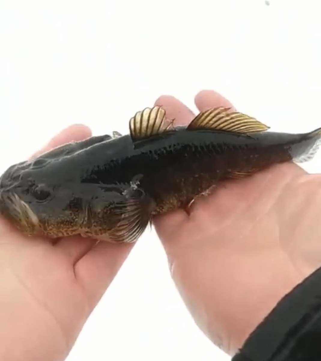 Примерно пробурив лунки в известной мне локации я проверил их подводной камерой и в одной из лунок с метровой глубиной увидел ротана. Место выбрал точно. На первом же забросе последовала холостая поклевка на монтаж ДжигРиг с крючком 14 и полярисом 30 мм в цвете машинное масло. Надо сказать что я на всякий пожарный случай взял с собой мелко нарезанное сало, на которое как известно ротан превосходно клюет. Но задача была во что бы то ни стало разловить оснастку и вторая же поклевка оказалась удачной, был пойман ротан да причем не мелкий.