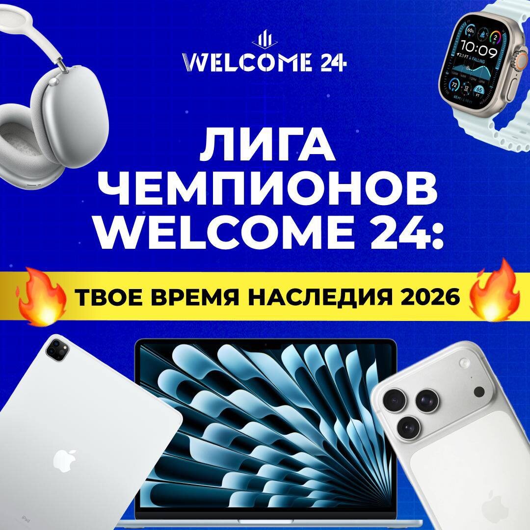 Настоящая игра для тех, кто хочет больше: больше сделок, больше финансов, больше статуса 😎 🚀 «Лига чемпионов WELCOME 24» — мотивационная программа для лучших партнёров агентства Зачем мы это делаем? Потому что сильные результаты должны вознаграждаться, а победы — запоминаться надолго Мы запускаем трёхэтапную систему мотивации, где: — каждый рывок даёт результат здесь и сейчас — весь год ты борешься за лидерство — в финале ты — «легенда WELCOME 24» 👉🏼 Этап 1. Весенний спринт (1 января — 30 июня) • Условие: ВКД от 2 млн ₽ за 6 месяцев 🥇 1 место — смартфон iPhone 17 Pro Max 🥈 2 место — часы Apple Watch Ultra 👉🏼 Этап 2. Осенний драйв (1 июля — 31 декабря) • Условие: ВКД от 2 млн ₽ за вторые 6 месяцев 🥇 1 место — планшет iPad Pro 11 🥈 2 место — наушники AirPods Max 2 👉🏼 Абсолютное первенство 2026 • Условие: суммарный ВКД от 5 млн ₽ за год 🔥 Главный приз — MacBook Pro 14 M5 Пять агентов с самым высоким ВКД по итогам года получают статус, который нельзя купить🤩 Что ждёт