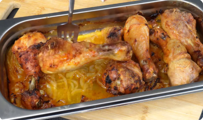В гастроемкость на дно положила лук, на лук куриные ножки