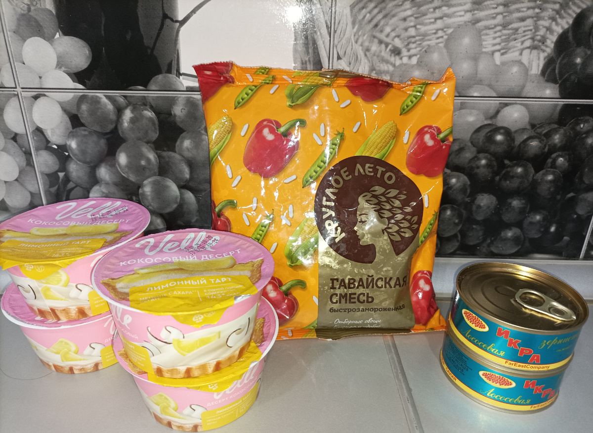Первая закупка была в Дикси примерно на 1100 рублей. Икру купила любимым продуктом по 400 рублей в запас. На следующий день цена выросла, скидки уже нет. А в Пятерочке по 750 рублей самая дешёвая.