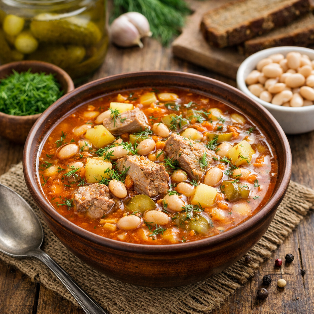 Если вы любите рассольник за его характерную кислинку, но не жалуете перловку, этот вариант станет настоящей находкой. Суп получается густым, насыщенным и при этом готовится быстрее, ведь мы используем консервированную фасоль. Подойдёт любая — белая или красная, в собственном соку или в томатном соусе. 1. Варим бульон
