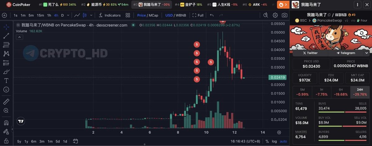 Он купил 6,25m #我踏马来了 (Here I come) за $85, после чего продал 1,53m токенов за $31,5k, а оставшиеся 4,72m ($115k) холдит до сих пор.