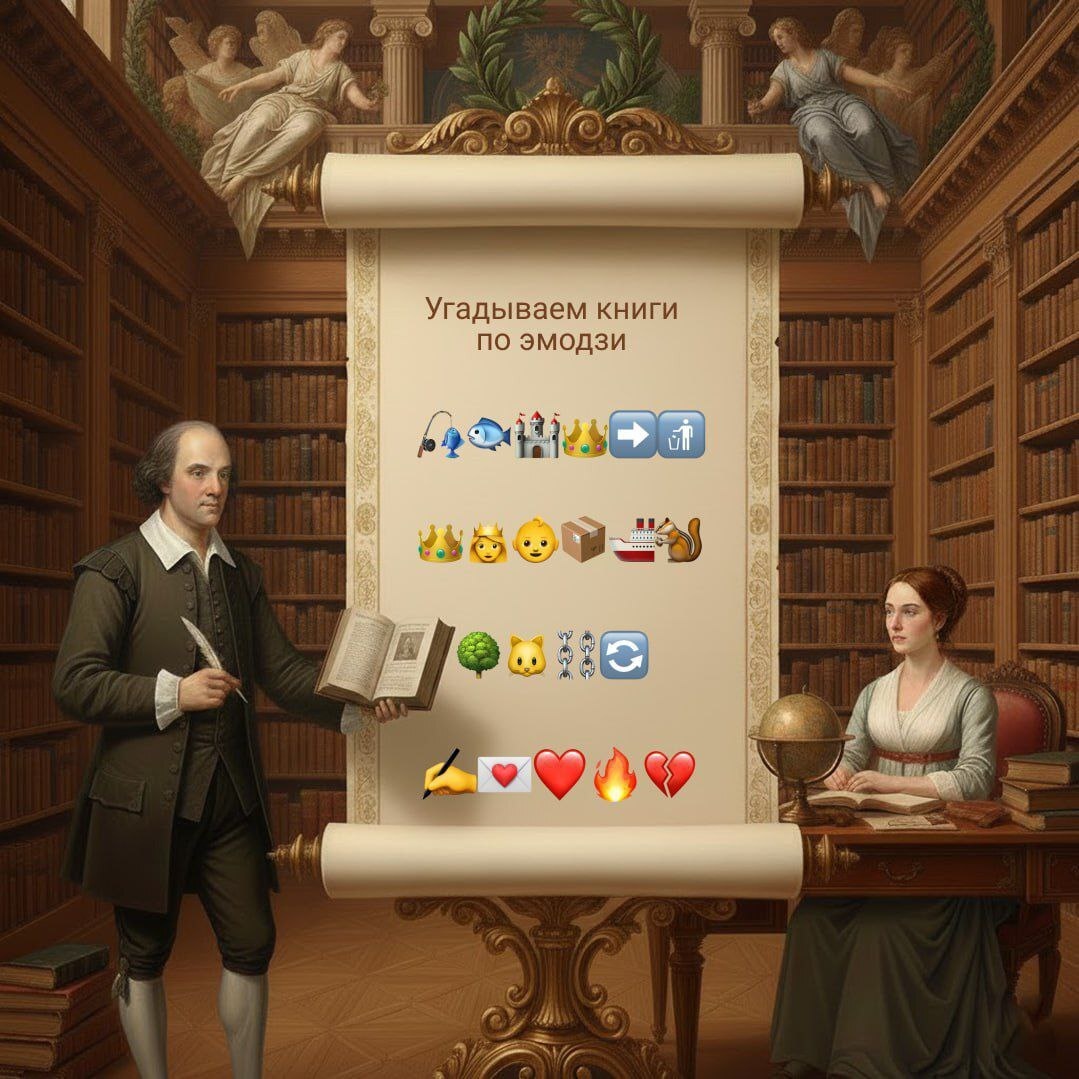 📜🪶Подготовили разминку для ума. Угадайте произведения Александра Пушкина по эмодзи на карточке и пишите ответы в комментариях.
