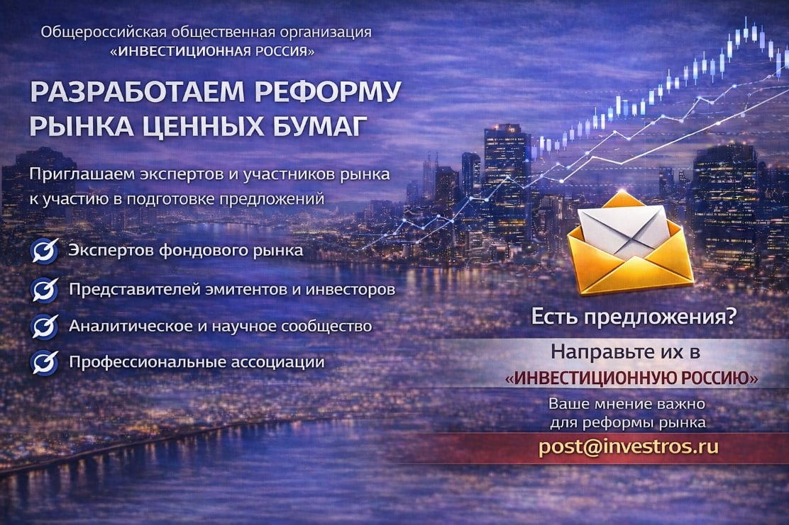 Общероссийская общественная организация «Инвестиционная Россия» формирует пакет предложений по реформированию российского рынка ценных бумаг, направленный на увеличение числа эмитентов и инвесторов, развитие инфраструктуры рынка и повышение его прозрачности и эффективности. Работа над инициативами ведётся с участием депутатов, профильных экспертов, представителей финансового и инвестиционного сообщества. Мы убеждены, что качественные и жизнеспособные реформы возможны только при активном участии профессионалов рынка. В связи с этим «Инвестиционная Россия» приглашает к сотрудничеству: ▪️экспертов фондового рынка и финансового сектора; ▪️представителей эмитентов и инвесторов; ▪️участников инфраструктуры рынка; научное и аналитическое сообщество; ▪️профессиональные объединения и саморегулируемые организации. Мы открыты к приёму предложений, аналитических материалов, инициатив и практических кейсов, направленных на развитие рынка ценных бумаг в России. Свои предложения вы можете направи