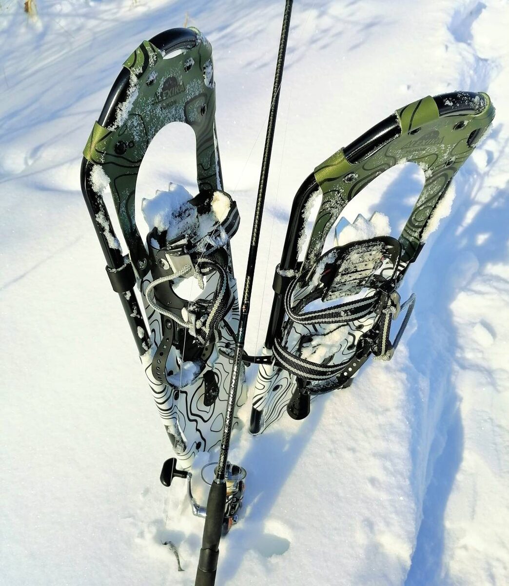 «Сердце будущим живёт, настоящее уныло…» Слова поэта вполне можно применить к зимнему существованию заядлых спиннингистов. Большинство водоёмов закованы льдом, берега укрыты толстым слоем снега – нет для спиннингиста более печальной поры… И всё же открытую воду в непосредственной близости от больших городов найти можно. Чаще всего это участки рек с «тепловой подпиткой» от промпредприятий или крупных ТЭС. В Нижегородской области наиболее известна т.н. Теплушка в Балахнинском районе – она не замерзает даже в приличные морозы. Если не брать в расчёт аномально-тёплую зиму 24-25, то берега даже «открытых» рек зимой обычно занесены снегом. Если снеговой покров «ниже колена», то вполне можно пробиться к реке и в зимних сапогах, но если снега больше, понадобятся снегоступы – нехитрое, в целом, приспособление, которое можно рассмотреть на первой фотографии данной заметки. Сапоги применяются те же, что для зимней подлёдной рыбалки: эва с «вкладышем», только для ходовой спиннинговой рыбалки надо
