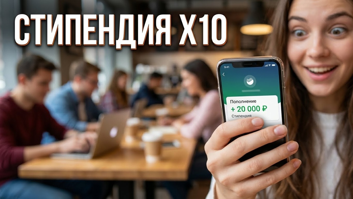 Wide 16:9 realistic photo. Close-up of a smartphone screen showing a banking app notification: "Refill +20,000 RUB. Scholarship". The background is a blurry university cafe. A student is holding the phone, looking surprised and happy. Text on the image in big bold Russian letters: "СТИПЕНДИЯ Х10" or "ПГАС ЛЕГКО".
