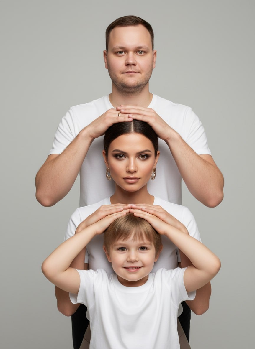 🔥 Хватит выстраиваться в ряд, как на школьной линейке. Ловите концепт «пирамиды», который круто смотрится в любой день года. Загружаем рефы всех участников в бот и получаем стильный вертикальный портрет. ⚡️ Фотографически реалистичное фото, использующее точные черты лиц всех людей загруженных эталонных изображений. Необходимо сохранить 100% сходства и идентичности всех людей. В кадре [количество людей по загруженному фото референса]. [Студийный семейный портрет] в необычной вертикальной композиции: люди [расположены друг за другом по росту, каждый последующий выше предыдущего]. Каждый человек [положил руки на голову того, кто находится перед ним, кроме самого нижнего]. Все одеты в [одинаковые качественные белые футболки]. [Минималистичный однотонный фон без лишних деталей]. [Мягкое студийное освещение с естественными тенями]. [Прямой фронтальный ракурс, средний план]. Высокая детализация, текстура кожи, 8k. Как менять: 👀 🎯 Ракурс и план (замени [прямой фронтальный ракурс, средни