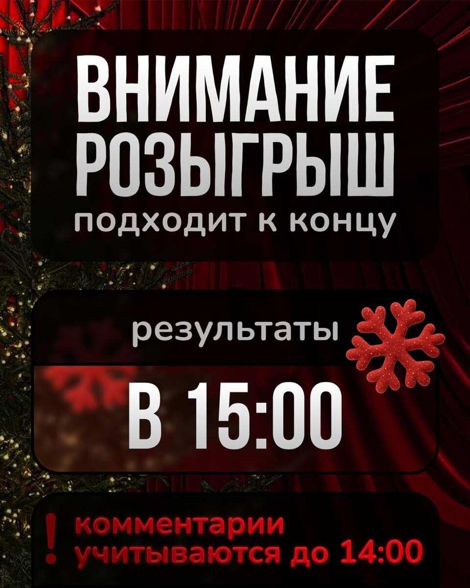 ! ⏳ Комментарии принимаются и учитываются до 14:00 по МСК. После этого фиксируем участников и закрываем список. 🏁 Итоги объявим в 15:00 по МСК. Проверяйте уведомления и будьте на связи. Удачи всем! 🎁✨