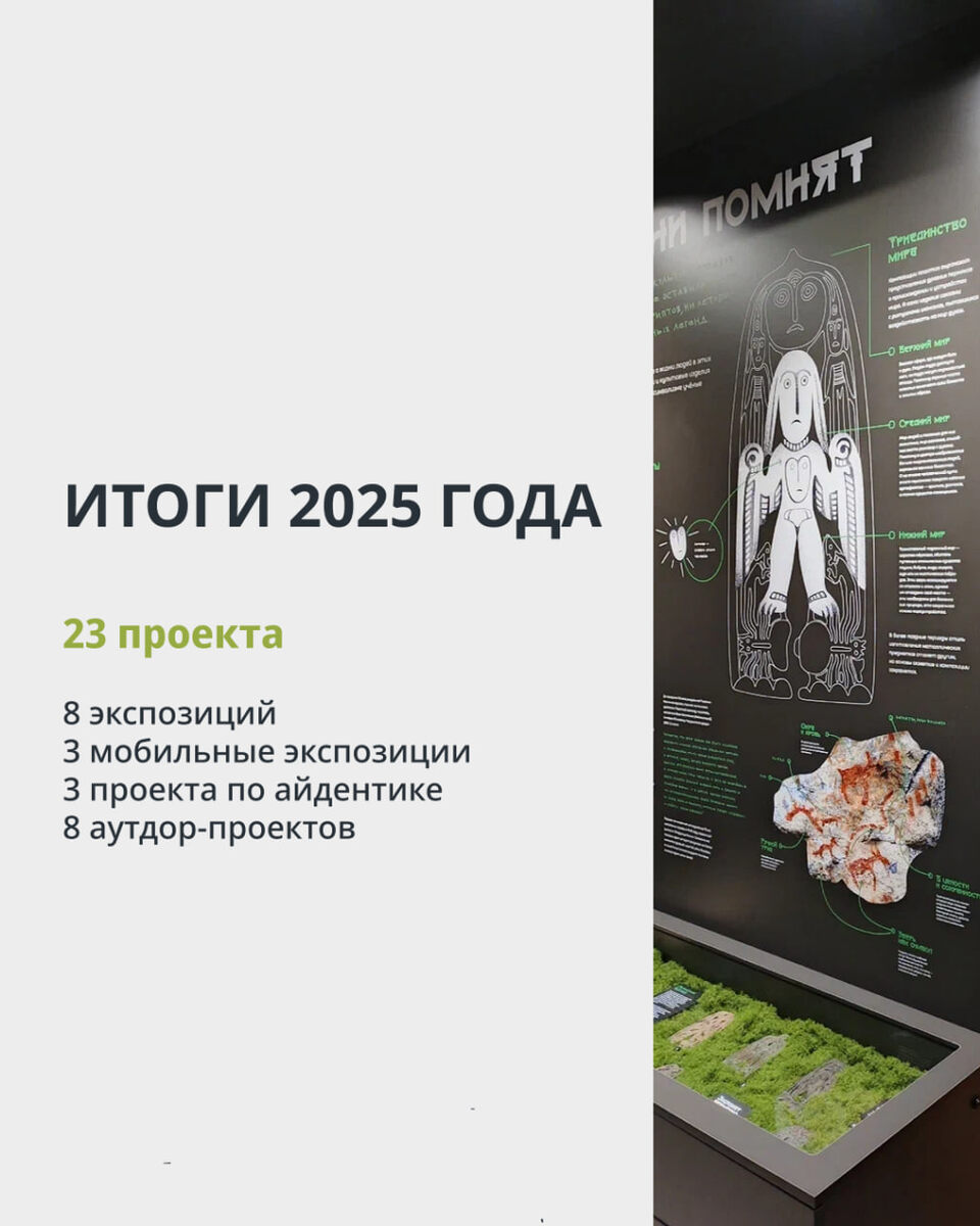 🌱 Начали работу над экспозицией для второго Дома дикой лошади в Хакасском заповеднике — уже знакомые нам лошадки Пржевальского и новая глава в программе реинтродукции. 🌱 Породнились с тайгой! С ней было связано сразу три разных проекта: экспозиция «Музей Уссурийской тайги» для АНО «Амурский тигр», экомаршрут «Вначале был лес» для природного парка Самаровский Чугас и, конечно, экспозиция «Хроники Чердыни. Глава I. Пермь Великая» об исторических событиях, развернувшихся на сцене пармы — древней уральской тайги. 🌱 Внесли свой вклад в сохранение исторической памяти о событиях Великой Отечественной войны — вместе с партнёрами на волонтёрских началах создали мемориал памяти узников концлагерей в Воронежской области, установили стенд «Землянск героев» и бюст Героя Советского союза Алексея Леженина. 🌱 В сотрудничестве с нашими постоянными партнёрами Mobil-Expo создали мобильные экспозиции: «Маленький город — большая история» о жителях Мегиона, участвовавших в ВОВ, «Многовековая Югра. Начал