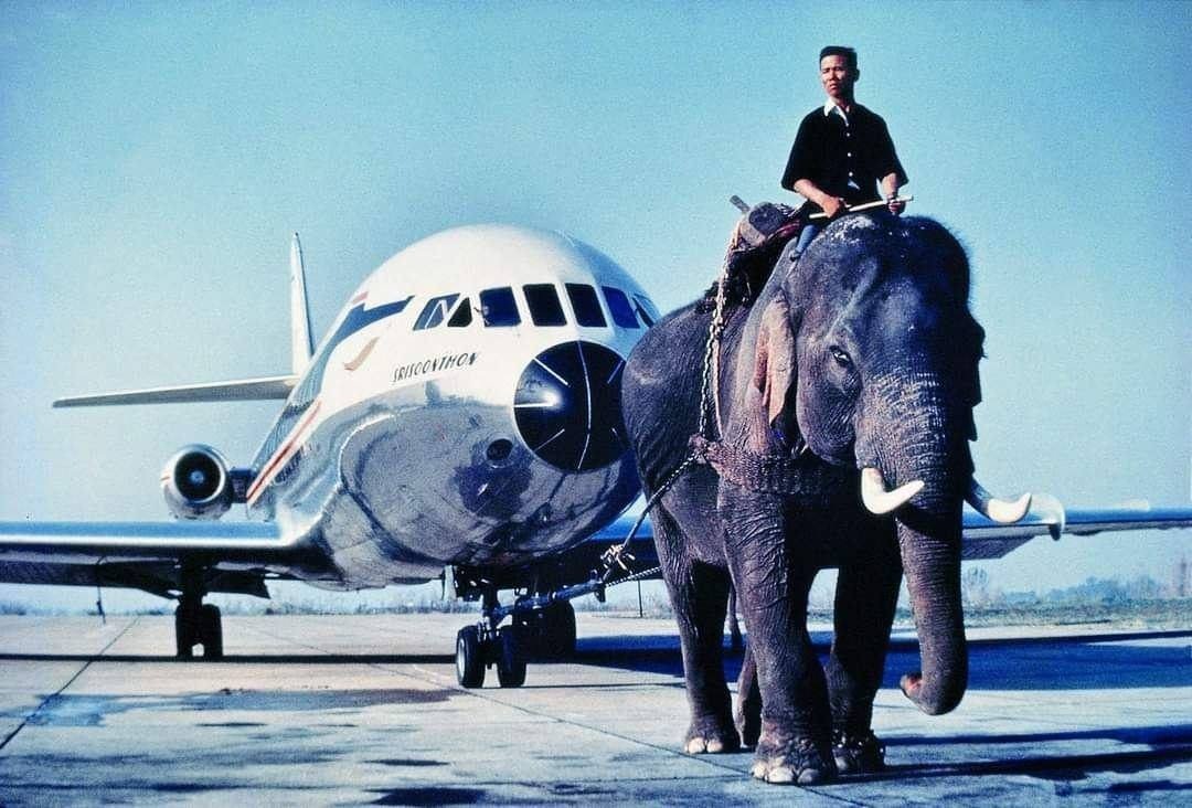 Слоны никогда не служили аэродромными тягачами в Таиланде. Не верьте снимку! Фото было опубликовано в книге, выпущенной к 50-летию национальной авиакомпании Таиланда. Подпись гласила: «Слон буксирует самолет “Caravelle” на рекламном плакате 1968 года». То есть это просто постановка для привлечения внимания. Хотя выглядит действительно эффектно. #История_факт