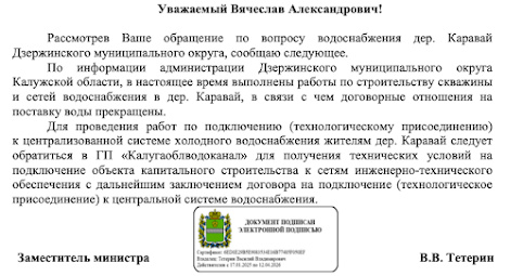 Губернатору Калужской области В.В. Шапше Запрос информации Уважаемый Владислав Валерьевич! 29.12. 2025 года я обращался к вам с письмом: В редакцию газеты обратился Бобылев Владимир Александрович Дзержинский район, д. Каравай, ул. Новая, дом 13 Телефон 89108661328 по вопросу снабжения водой. По непонятным причинам им в деревню Каравай перестали возить воду по решению суда. Прошу поделиться информацией почему перестали возить воду и как им быть без воды. В полученном ответе говорится: По факту ничего этого нет. Более того, позвонив исполнителю этого письма заявила, что в Каравае установлена водоразборная колонка. Житель деревни Каравай Владимир Бобылев проверил сегодня утром и не обнаружил этой колонки. Прошу поделиться информацией почему обманываете население. От этого доверия к вам все меньше и меньше. Поделитесь когда будет водопровод в деревне Каравай. Вот что по факту Это тот самый водопровод. И колонки здесь не просматривается. Во всяком случае, местные жители не обнаруживают. Се