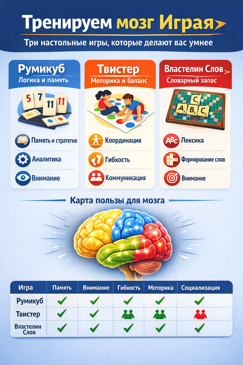 Составляете слова из букв, следите за доской и стратегически планируете ходы: Совет: комбинируйте разные игры — и мозг, и тело будут в тонусе, а удовольствие от процесса гарантировано. Больше коротких научных разборов — в Telegram @meelahMD. #настольныеигры #мозг #когнитивныенавыки #Румикуб #Твистер #ВластелинСлов #иградыляума #развитиемозга #здоровьемозга