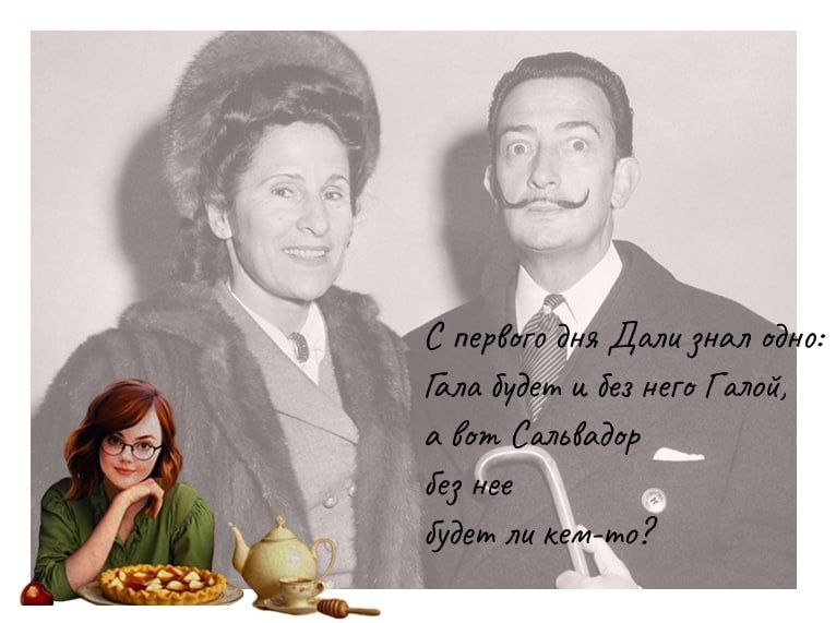 Не всё просто в этой паре. Сложный день всегда легче начинать с чужих сложностей😁 Так что рассказываю. «Как некрасивая молчаливая московская девочка стала властительницей жизней сначала Поля Элюара, а потом величайшего художника и мистификатора нашего века Сальвадора Дали» — вот о чём книга «Жизнь, придуманная ею самой». Книгу написала Елена Ивановна Гомберг-Дьяконова, или Гала, как она себя потом стала называть. Гала Дали — муза и жена Сальвадора Дали. Их история начиналась райским слиянием, а закончилась разочарованием. В последние годы Гала, правда. заигравшись в «создание гениев», решила уйти от Сальвадора, чтобы найти нового, молодого любовника и прожить ещё одну жизнь-восхождение. Так, она смогла бы снова потешить гордыню, ведь Сальвадор уже к тому моменту стал слишком большой звездой и, наверное, не давал прежней подпитки её нарциссизму. «Конечно, из трухлявой деревяшки не выточишь Аполлона, для этого нужен мрамор» — писала, но мрамора после Сальвадора больше не повстречалось.