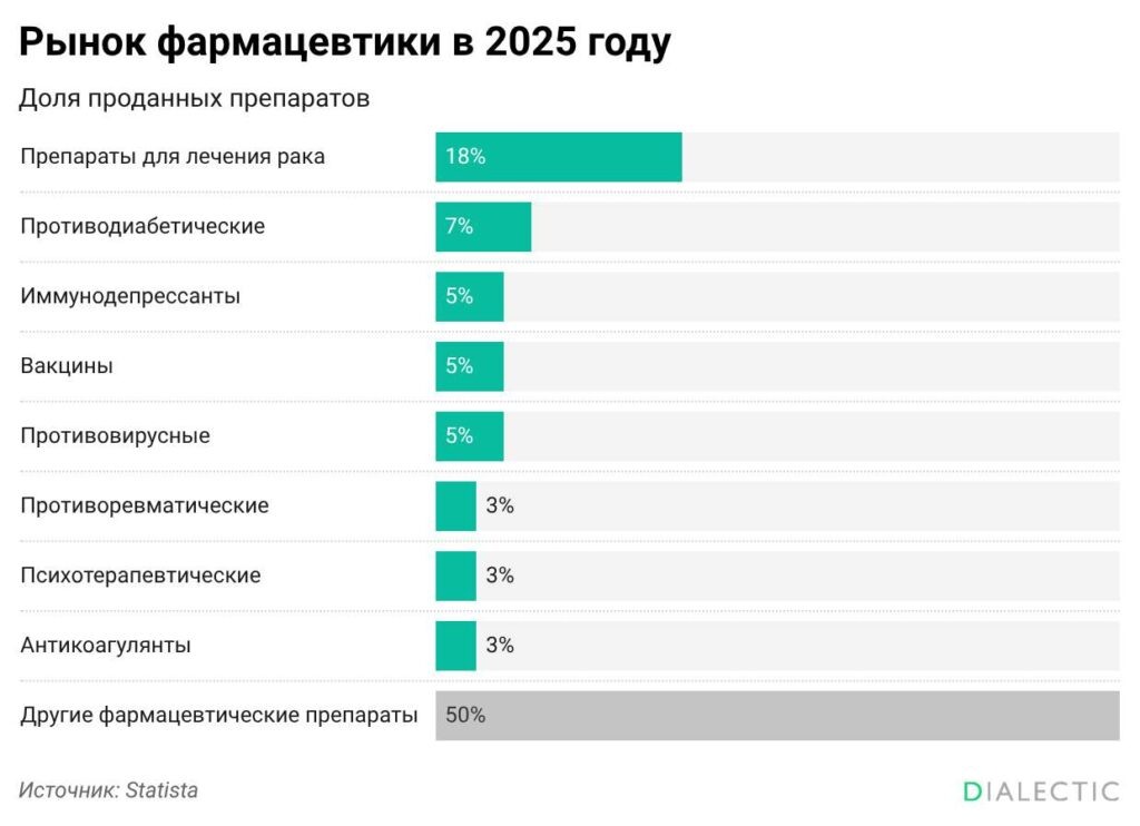 Глобальный фармацевтический рынок в 2025 году сохранил восходящую динамику, при этом доминирующую долю в структуре выручки заняли препараты для терапии онкологических заболеваний. Об этом свидетельствуют данные аналитического отчета платформы Statista Market Insights. Согласно оценкам экспертов, продажи противоопухолевых средств превысили 217 млрд долларов, что составило 18% от общемирового оборота лекарственных препаратов. Вторым по значимости драйвером индустрии стала категория антидиабетических средств, выручка в которой преодолела отметку в 85 млрд долларов (7% рынка). Аналитики подчеркивают, что онкология остается крупнейшим терапевтическим кластером, удерживая лидерство с существенным отрывом от иммунологии и средств для коррекции метаболических нарушений. Финансовые показатели отрасли во многом определяются реализацией нескольких препаратов. Ключевую роль играет Keytruda от компании Merck, который по итогам 2024 года принес производителю почти 30 млрд долларов. Параллельно фикси