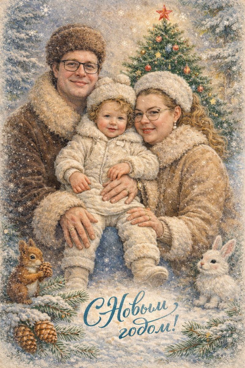 ! У кого-то сегодня первый рабочий день, а у меня — наконец-то первый выходной от работы мамой =) Иногда мне кажется, что мамы малышей живут в противофазе со всем миром: когда у всех праздники — садики закрыты, а у мам дел становится только больше. Алиса ещё и почти весь декабрь проболела, поэтому я очень ждала её возвращения в сад и этих редких тихих часов дома. Хотя на каникулах было много радостного: встречи с близкими, прогулки и даже мини-путешествие с ночёвкой в отеле. 🫶 А как у вас прошли праздники? 🟣На волне новогоднего настроения хочу поделиться двумя промтами для ИИ, которые мы уже опробовали дома. К посту прикреплю иллюстрации, сделанные по ним. ➡️ Первый промт — для создания винтажной открытки в стиле СССР по вашему фото. Идею подсмотрела тут: Создай винтажную новогоднюю открытку на основе загруженной фотографии. Стиль — советские сказочные открытки 1950–1970-х годов, мягкая живописная иллюстрация, ощущение тепла и уюта. Композиция и формат: Вертикальный формат 9:16