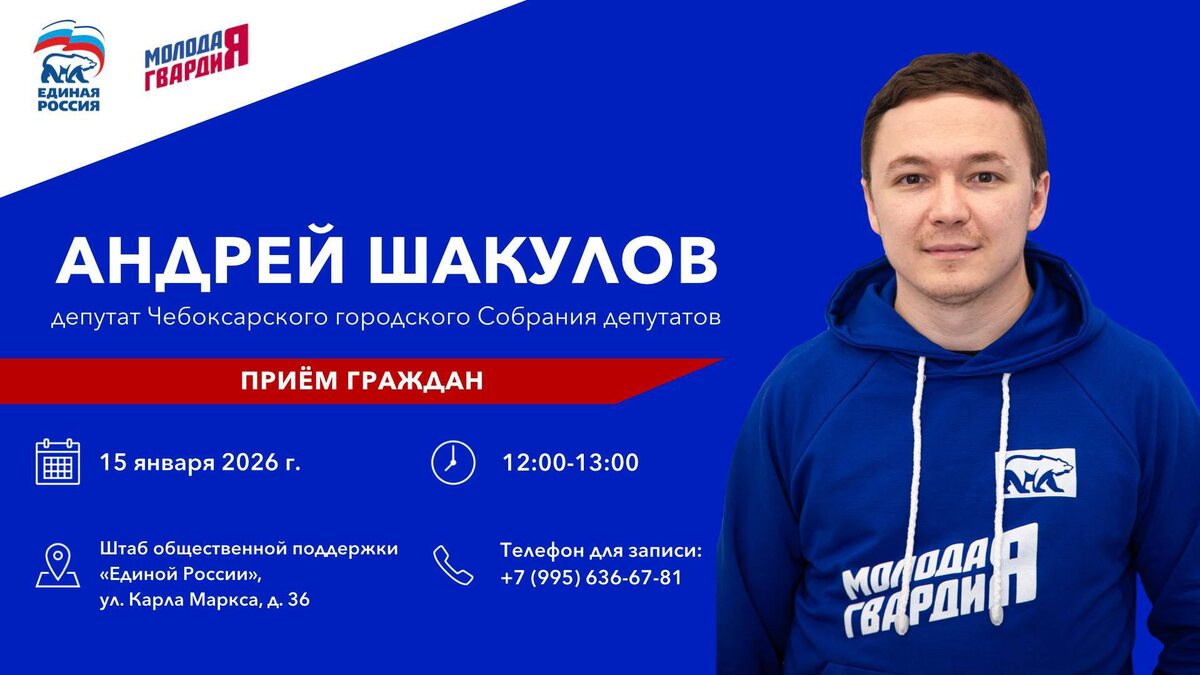! Уже 15 января 2026 года встретимся на приёме граждан в Штабе общественной поддержки «Единой России» по адресу: ул. Карла Маркса, д. 36. Приходите и делитесь своими предложениями или вопросами, которые нужно решить. ➡️ Запись по телефону: +7-995-636-67-81 #МолодаяГвардия #ЕдинаяРоссия #ЕР21