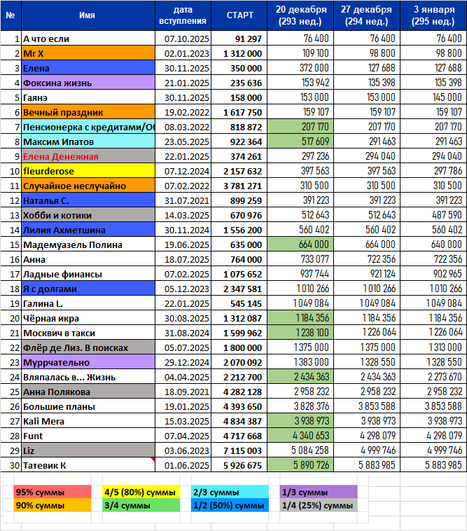 Привет всем! Результаты очередной недели - готовы. Подумать только, 295 недель! Еще немного - и будет 300-недельный юбилей! Вот так постоянство: неделя за неделей мы продвигаемся к финишу, кто мелкими перебежками, кто большими шагами. Кого-то с почестями проводили в свободную от долгов жизнь, но были и те, кто сошел с дистанции на середине пути... Что же принесла нам эта неделя? Давайте посмотрим: Ну и сразу перейдём к основной части - нашим кубкам. Золото получает Вляпалась в жизнь, погасившая 160693р! С большим отрывом второе и третье места занимают fleurderose и Флёр де лиз, погасившие 99777 и 62000 соответственно. Здесь позиции немногом еняются: первое место так же за fleurderose - она погасила 25,1% от долга! На втором месте - Вляпалась в жизнь, с результатом минус 6,6%, а на третьем - Гаянэ, с уменьшением на 5,23%. Поздравляем! Ничего не поменялось в долгосрочном погашении: кто какие места занимал на прошлой неделе, такие же занимает и сейчас. Результаты всех участников вы может