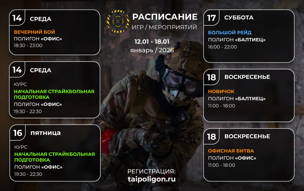На этой неделе вас ждут жаркие игры и полезные курсы: ➡️ Курсы 🔵 Начальная страйкбольная подготовка • 14 января, среда | 19:30–22:30 • Полигон «Офис» 🔗 Запись на занятие: https://docs.google.com/spreadsheets/d/1IUfHxM-A3hACF0-07t1JuIL3onqIQ1HhVKtIzSqRX54/edit?gid=1198293672#gid=1198293672 🔵 Начальная страйкбольная подготовка • 16 января, пятница | 19:30–22:30 • Полигон «Офис» 🔗 Запись на занятие: https://docs.google.com/spreadsheets/d/1IUfHxM-A3hACF0-07t1JuIL3onqIQ1HhVKtIzSqRX54/edit?gid=753988984#gid=753988984 ➡️ Открытые страйкбольные игры 🟢 Вечерний бой • 14 января, среда | 18:30–23:00 • Полигон «Офис» 🔗 Регистрация: https://taipoligon.ru/strikebudni 🟢 Большой рейд • 17 января, суббота | 16:00–22:00 • Полигон «Балтиец» 🔗 Регистрация: https://taipoligon.ru/raidbalt 🟢 Офисная битва • 18 января, воскресенье | 11:00–18:00 • Полигон «