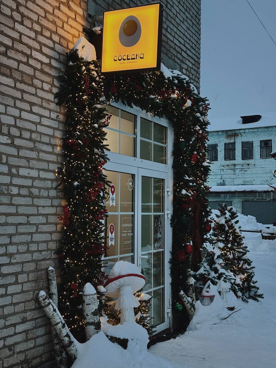 Приехали в Коломну, а до старта экскурсий ещё целый час? Знакомая ситуация. Решение есть — кафе «Соседка» в самом центре. Здесь вас накормят вкусными завтраками (all day), напоят авторскими напитками и погрузят в новогоднюю сказку с первого взгляда. «Соседка» встречает гостей уже с порога. Входная группа — это отдельное произведение искусства: хвойные веточки, мерцающие гирлянды, яркие шары и главные хозяева — очаровательные грибы-мухоморы. Не пропустите стильное зеркало в резной раме — первая и обязательная фототочка. Внутри очень камерно и уютно: всего 4 столика и компактная барная стойка. Но в этой миниатюрности — весь шарм. Тёплый свет, деревянные поверхности, новогодний декор. Здесь хочется остаться. Заведение работает по простой схеме: заказ делаете на кассе, а потом его приносят к столик. У самой стойки — милая деталь: доброе пожелание на день и можно взять открыточку с рукописным посланием на обороте. Персонал вежливый и приятный, что добавляет очков к общей атмосфере. В основе