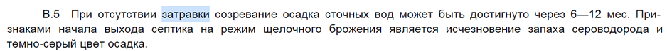 В учебниках по водоотведению и очистке стоков написано, что нужно оставлять. В частности, учебник для ВУЗов под редакцией проф. Ю. В. Воронова на стр. 694 гласит следующее: «Около 20% осадка необходимо оставлять в иловой камере для затравки вновь поступающего осадка анаэробными микроорганизмами, что ускоряет процесс его разложения». А, сколько тогда составляют эти 20% в натуральном измерении? Если следовать рекомендациям, и удалять осадок из септике при его уровне 30% от общего уровня стоков в септике, то 20% это около 9 см (150 х 30% х 20%) при уровне стоков в септике 150 см. Вообще-то, выкачать весь осадок из септика, как ни старайся, не получится. Но, что случится, если попытаться выкачать почти весь осадок, несмотря на рекомендации. Биологический процесс нарушится, и, пройдет примерно полгода, прежде чем он сам восстановится. Это проверено практикой, и об этом написано в ГОСТ 70818-2023, Приложение В, п.В.5: В общем, септик будет противно пованивать в течение полугода после выкачив