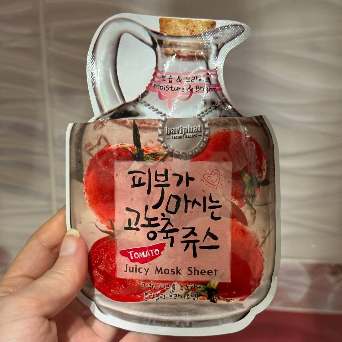 Плоский пакетик, стилизованный под стеклянную банку с пробкой, с нарисованными томатами внутри. Смотришь и хочется поставить на полку в ванную, как маленький элемент декора. Сзади инструкция на корейском и английском, всё аккуратно, ясно и по делу. Вскрываю, внутри море эссенции и стыдливо свернувшаяся в уголок сама тканевая маска, как школьник на линейке. Хотя маска томатная, пахнет она совсем не томатом.