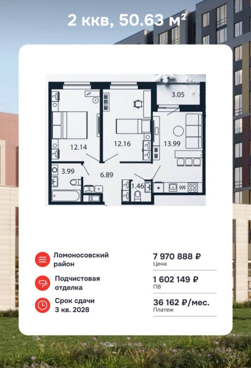 Новоселье» ✅2 ккв, 50.63 м ✅Семейная ипотека без удорожания от Металлинвестбанка: ✅ цена - 7 970 888 ₽ ПВ -1602 149 ₽ платеж - 36 162 ₽ мес. По всем вопросам : +79667578789 Михаил