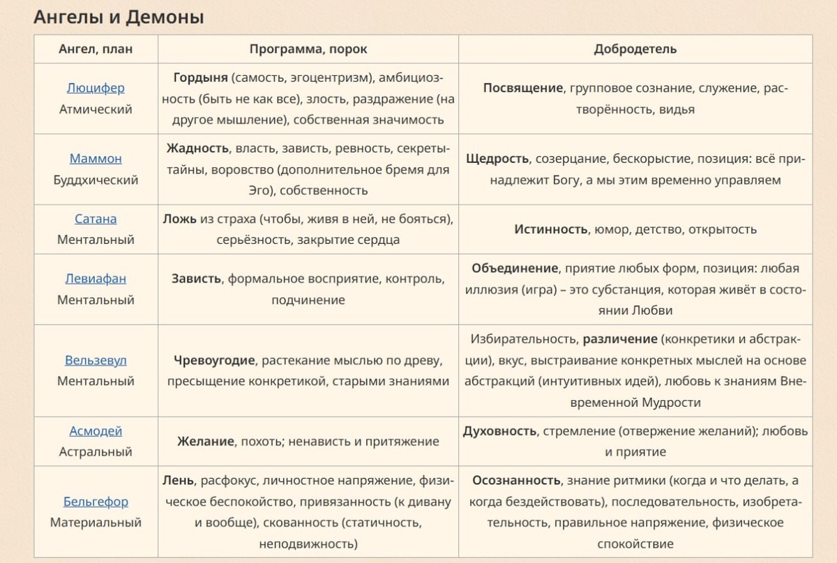 Добавлен последний, ранее пропущенный в компиляции, Асмодей - Ангел любви и приятия, создавший демона (программу) ненависти и притяжения. Это в некотором смысле главный демон, поскольку заведует астральным планом, на подпланах которого проявляются все демоны в принципе. Поэтому теперь человечеству должно быть проще в отвержении желаний и замене их на стремление! Помимо этого, для каждого Ангела и его демона добавлено перечисление пороков (грехов) и добродетелей, которым учит Ангел. Это прописано и в таблице в начале страницы. Теперь эта таблица в разы полезнее! А чтобы осознавание демонов и Ангелов шло эффективнее, и есть практики Бейтса. Они нужны для развития видения тех самых демонических программ и перевода их в "Ангельские добродетели". Ссылка на компиляцию всего, что Рюрик Олег Ю. передавал от Господа Мира по теме этих практик для зрения, тоже появится в Ангелософии в ближайшее время!