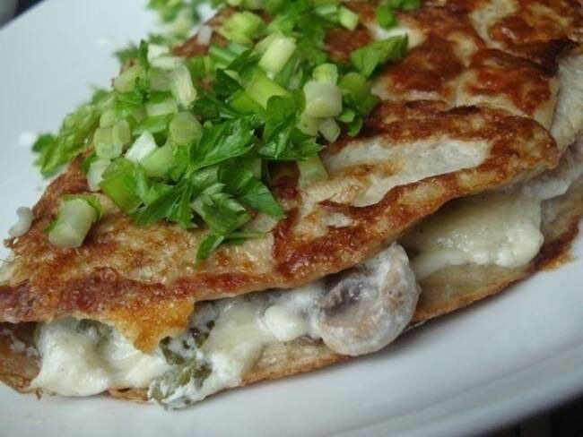 А пока жарится, режем шампиньоны и немного их обжариваем, также без масла. Выкладываем в посуду, туда же огурец, порезанный соломкой , сыр , сметану,горчицу, измельченный чеснок и перемешиваем. Начинка готова!