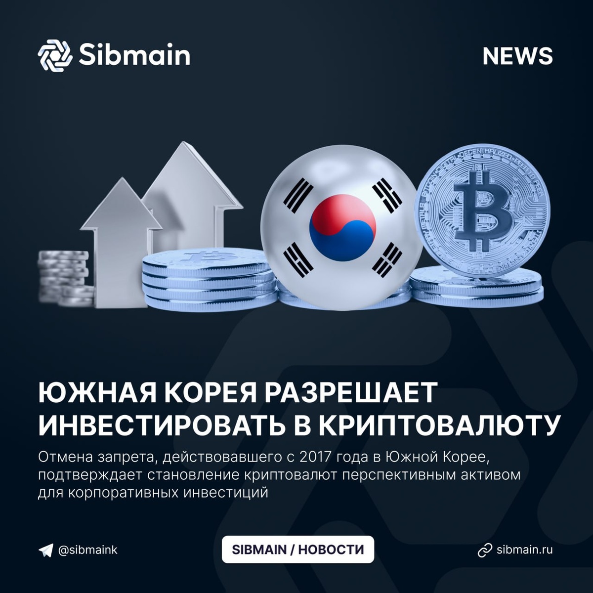 📰📰📰📰 ➡️Южная Корея разрешает инвестировать в криптовалюту Комиссия по финансовым услугам Южной Кореи впервые за 9 лет разрешила корпорациям инвестировать до 5% чистого капитала в топ-20 криптовалют. Доступ к криптовалютам получат: ⏺Биржевые компании; ⏺Корпоративные структуры; ⏺Профессиональные инвестиционные учреждения 📍Отмена запрета, действовавшего с 2017 года в Южной Корее, подтверждает становление криптовалют перспективным активом для корпоративных инвестиций