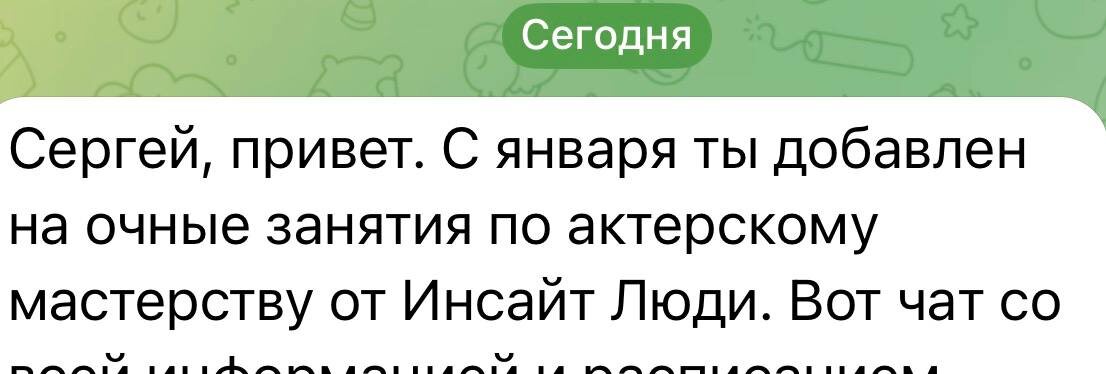 Просто хочу поделиться радостным и важным событием: с 19 января я начинаю обучение актерскому мастерству, да ещё и в семье Инсайт Люди 💙 Со второй половины прошлого года я ждал, когда смогу наконец-то этим заняться, так как чувствую необходимость. Принимаю поздравления в виде реакций на пост. Будет приятно🎉 Осознал, что ТГ канал нужен не только для умных мыслей и картинок, но и для того, чтобы можно было поделиться с друзьями чем-то радостным.