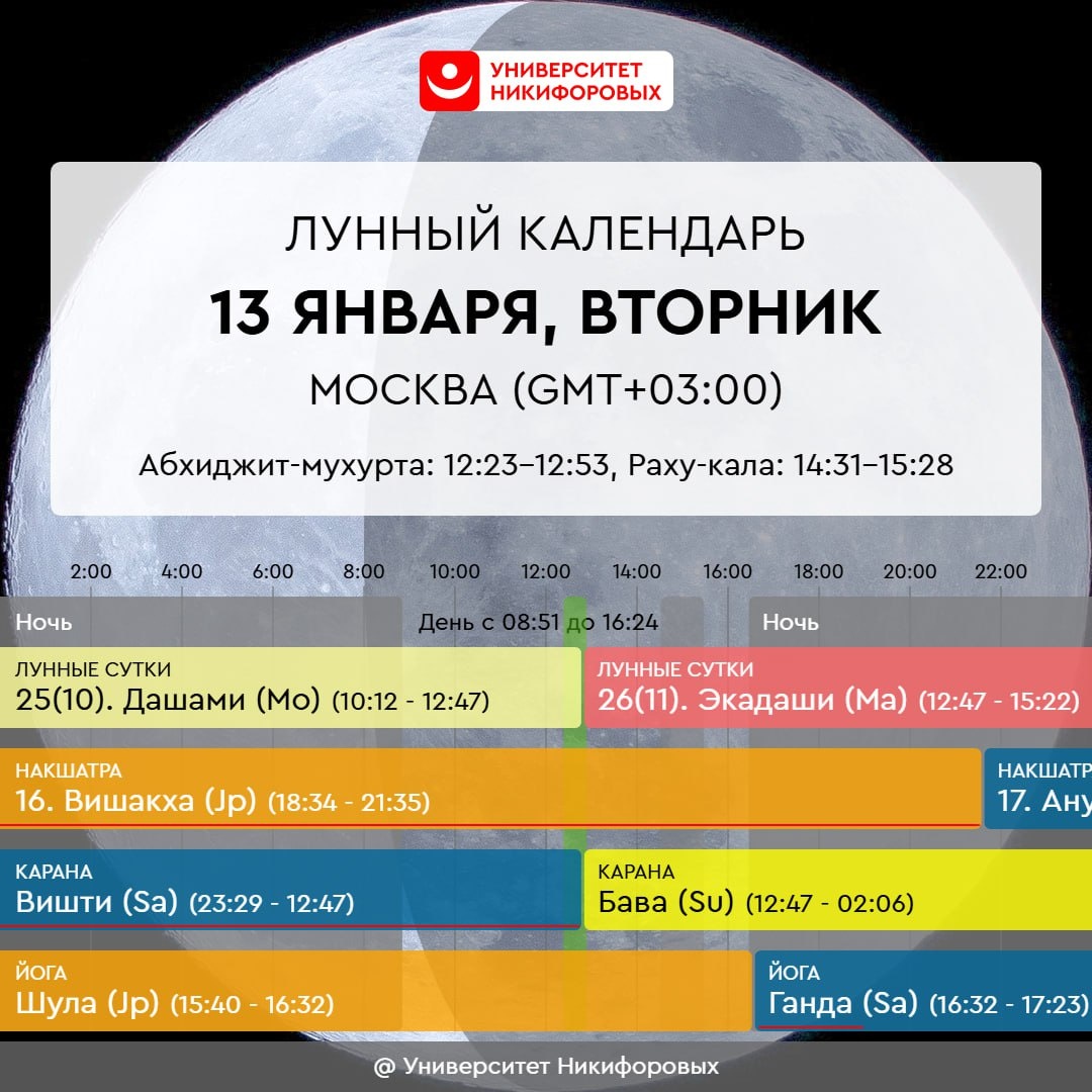 Энергетика дня не способна поддержать начинания и старты, общий уровень энергии снижен, может ощущаться упадок сил, присутствует повышенный риск травм и интоксикаций. Будьте аккуратны в обращении с техникой и огнем. Наиболее благоприятный промежуток выпадает на середину дня – с 12:48 до 16:33, он может быть неплох для решения интеллектуальных задач и действий, требующих умственной концентрации и аргументированного подхода. Приготовьте суп из красной чечевицы, это напитает и на физическом, и на тонком плане. Сегодня Венера переходит в знак Козерога и пробудет там до 5 февраля. Это достаточно хорошее положение для планеты, оно добавляет серьезности и рациональности в отношениях, однако в этот день Венера остается ослабленной и не может в полной мере поддержать наши устремления