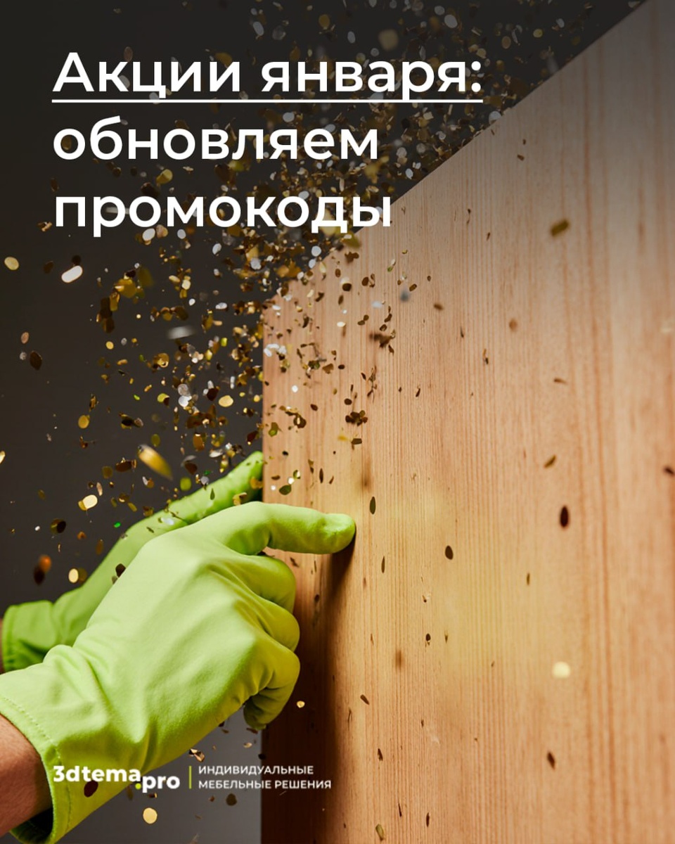 Друзья, собрали для вас все действующие акции января. Две скидки, два промокода — выбирайте свою выгоду 🙌🏻 ✅ 10% на фасады в шпоне европейского дуба Условия: заказ от 4 м², плита 18 мм, матовый лак, открытая пора, шпон без выбора пачки, рубашка "несоответствие"; Промокод: ТЕПЛОДОМА ✅ Скидка 3% на любые фасады Условия: все фасады с любой фрезеровкой и любым покрытием; Промокод: Зимняя сказка ❓ Как получить скидку? 1. Вы — подписчик нашего канала (это уже так!); 2. Выбираете фасады в нашем каталоге; 3. Называете нужный промокод менеджеру при оформлении заказа. Предложения действуют до конца января 2026 года. Обсудить проект и получить расчёт: 📱 @tema3d_imr