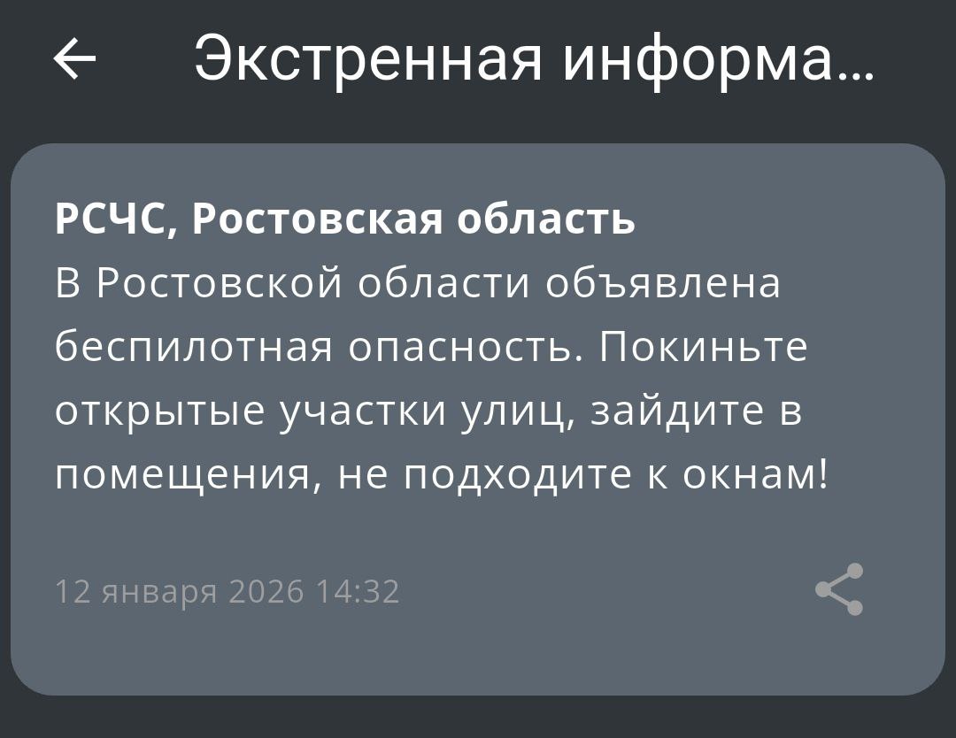 ‼️Экстренная информация РСЧС: В Ростовской области объявлена беспилотная опасность.